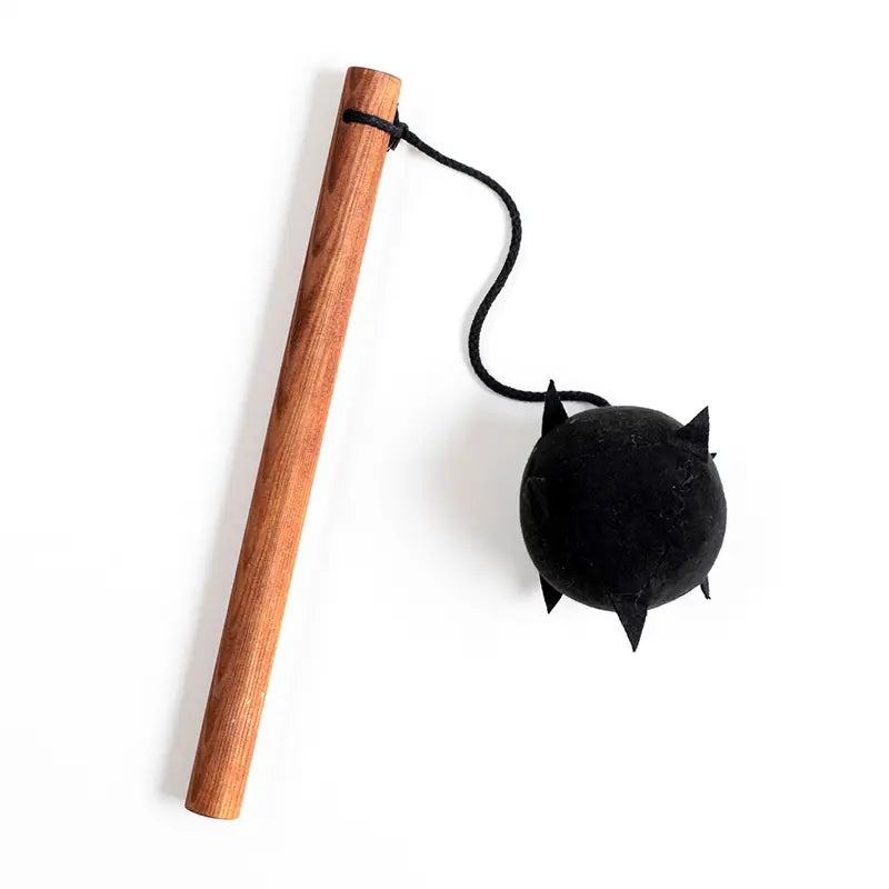 Wooden rod with a string tied to a padded felt morning star. Rod length: 11 inches. Made in Spain.